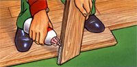 Parkettelements zur Bohrung hinführend ein keilförmiges Stück ausgeschnitten und nach dem