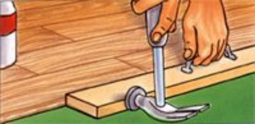 Mit dem Schlagklotz und einem Hammer werden die Dielen in Nut und