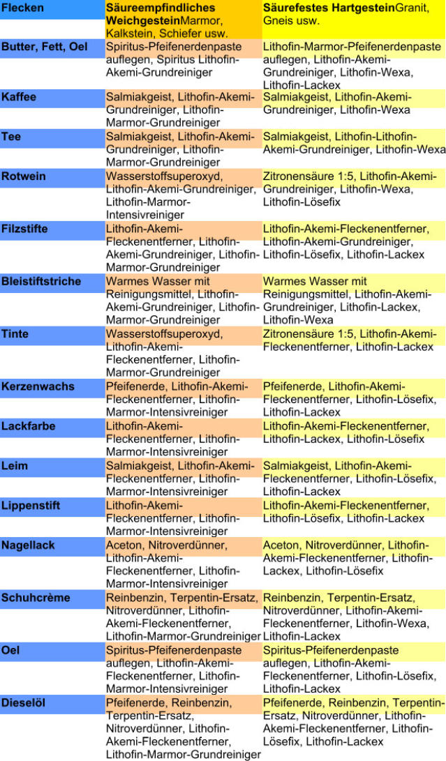Im Haushalt vorhandene Mittel zur Fleckenentfernung:lösen: Kältespray, Teppichschaum,