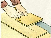 deckungsgleich auf die letzte verlegte Dielenreihe legen. Mit einem Restabschnitt und einem Bleistift