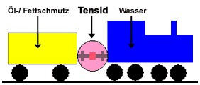 Gibt man Reinigungsmittel (zB. Seife) dazu und rührt die Mischung durch, erreicht man ein Emulgieren der verschiedenartigen Flüssigkeiten.Die emulgierenden Stoffe sind Tenside.Tenside bewirken ein zusammenhängen von Wasser und Öl.Tenside sind die Anhängekupplung die das Wasser bekommt, damit es Fette und Öl mitnimmt.